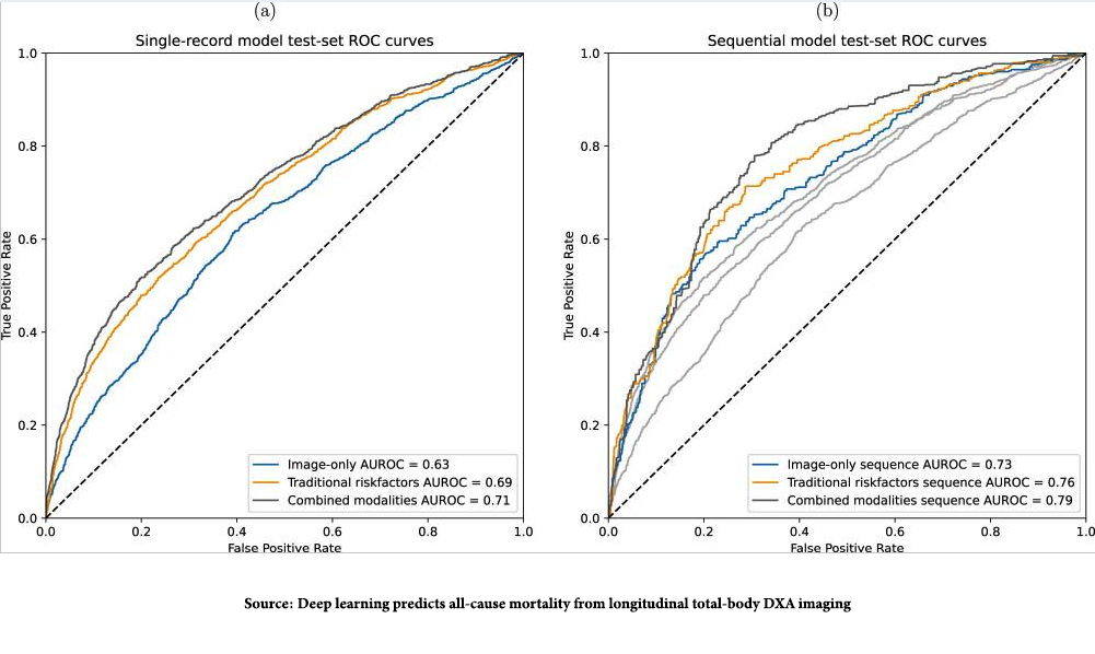 “This study demonstrates that combining full TBDXA scans and traditional mortality risk factors results in stronger mortality prediction models than using either modality on its own. The results presented here also show that the progression of body composition and health markers over time can be leveraged to further improve mortality prediction.”