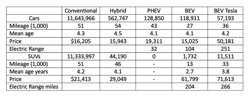 Interestingly, there currently are no electric pickup trucks, which represent about 20% of used car purchases, and no plug-in hybrid SUVs, which generally represent 40% of that same market.