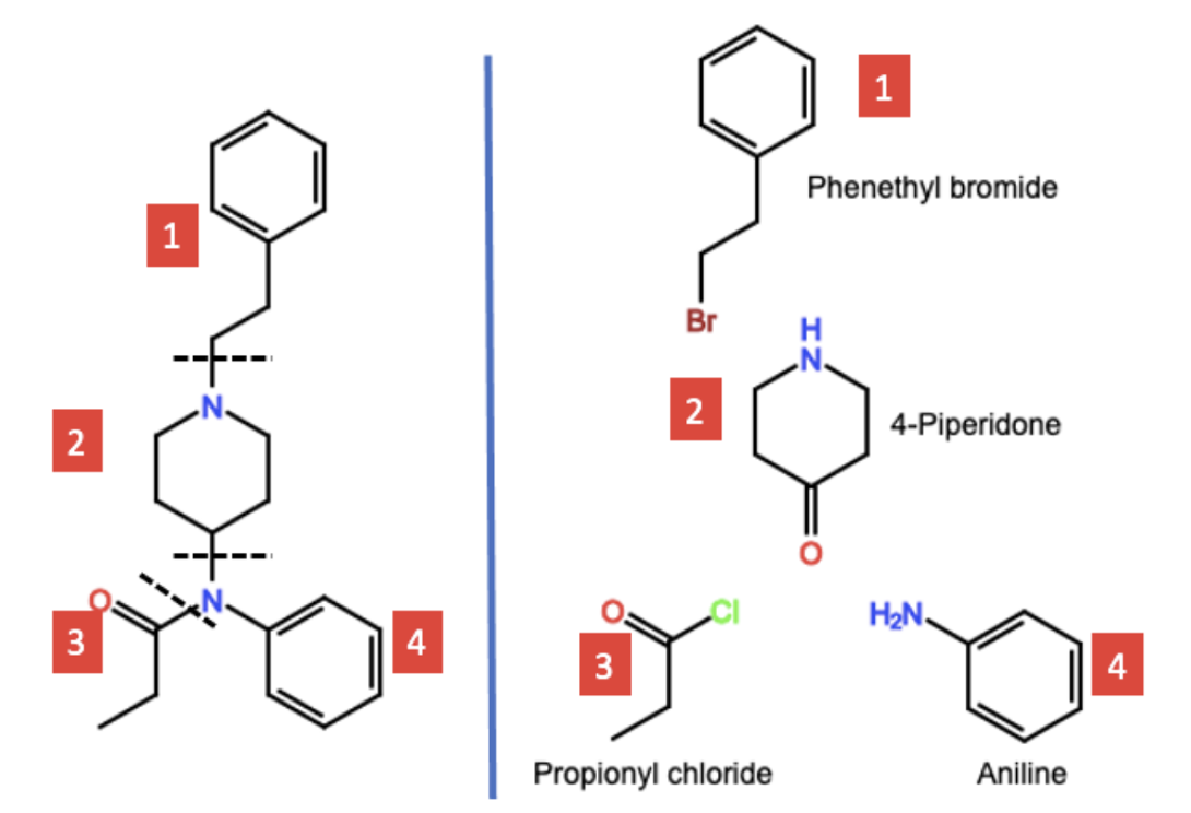 Fentanyl (left) can be broken up into four imaginary fragments (these are also called synthons) (1). On the left, I have divided the drug into theoretical sections (this process is called retrosynthetic analysis), which if put together chemically will make the drug. It is important to keep in mind that another organic chemist may look at the structure of fentanyl and come up with an entirely different retrosynthetic analysis. Let's go through mine –the original synthesis used by Janssen in the 1950s.