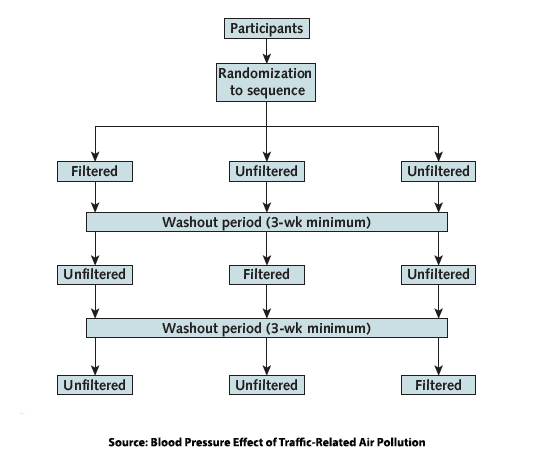 To consider the impact of TRAP on our blood pressure, researchers drove participants on a defined route through Seattle for 2 hours, beginning at 9:30 AM. Their car was closed to outside air, and all air entering it went through one of two possible filtration systems. The first was simply air through the car’s ventilation system with all filters removed. The second was the same setup, but now there were two filters: a conventional car filtration system and a HEPA filter capable of removing particulate matter and carbon. Participants and their drivers were blinded as to the presence or absence of the filters, and each participant was driven around on three occasions, twice without a filter and once with the filtration system. It was, therefore, a double-blind crossover study.