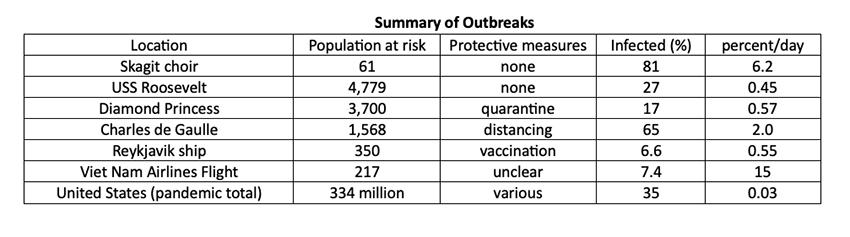 - The four shipboard outbreaks had similar daily infection rates despite differences in types of protective measures, illustrating the importance of prompt implementation of such protection.