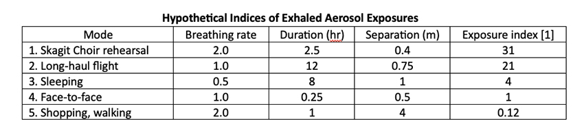 [1] I defined an exposure Index as b*t/d2 where b is respiratory rate, t is exposure duration, and d is separation distance. D is squared because exhalation will likely spread downwind as a cone rather than linearly as a jet.