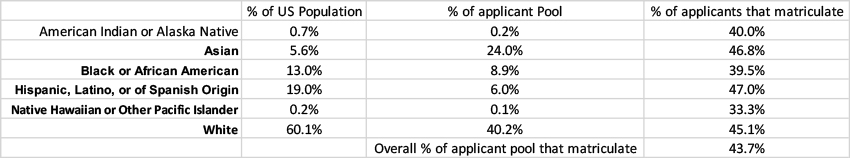 Did the schools actually fail to achieve diversity? Certainly, that argument can be made when the comparator is the racial breakdown of the US population. But when you consider the admitted class of 2027, it does not, it simply reflects the racial breakdown of the applicant pool.