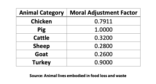 With or without moral adjustment, chickens are the most impacted species, demonstrating the vast number slaughtered and consumed globally. Pigs, considered to have the highest capacity for suffering and the greatest ability to perceive their situation, move up into second place on a list no one wants to be on. Cattle, sheep, and goats with less apparent cognitive abilities fight it out for the remaining places.