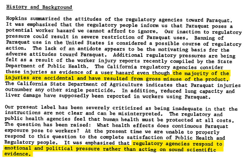 Gillam points to “secret files” from paraquat manufacturers Syngenta and Chevron to bolster her conspiracy, but this is just smoke and mirrors. When we read the documents themselves instead of relying on Gillam’s and McCormack's spurious allegations, we can see they contain much of the same information found in publicly available sources. Here’s one example from a 1974 Chevron memo, available on Gillam’s New Lede website: