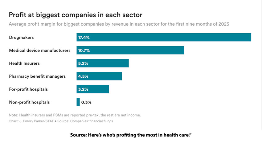 Let’s begin with this graph from a recent article in Stat entitled, “Here’s who’s profiting the most in health care.”