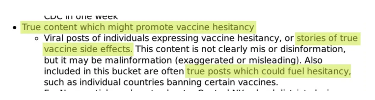 For instance, the Virality Project flagged “true content which might promote vaccine hesitancy” for suppression. This included “stories of true vaccine side effects” and posts that contained information “such as individual countries banning certain vaccines.” These examples were classified as potentially "malinformation," which could be "exaggerated or misleading."