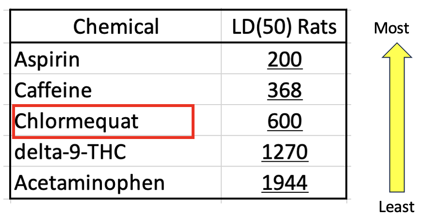 These data show that chlormequat's toxicity resides somewhere in the vicinity of aspirin, acetaminophen, caffeine, and THC. Is this really a toxic crop chemical?