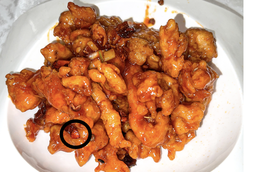 A delicious serving of the General's uber-popular dish. But beware of hidden pieces of chili pepper. They can blend in, as shown by the black circle of doom. Photo: Flickr