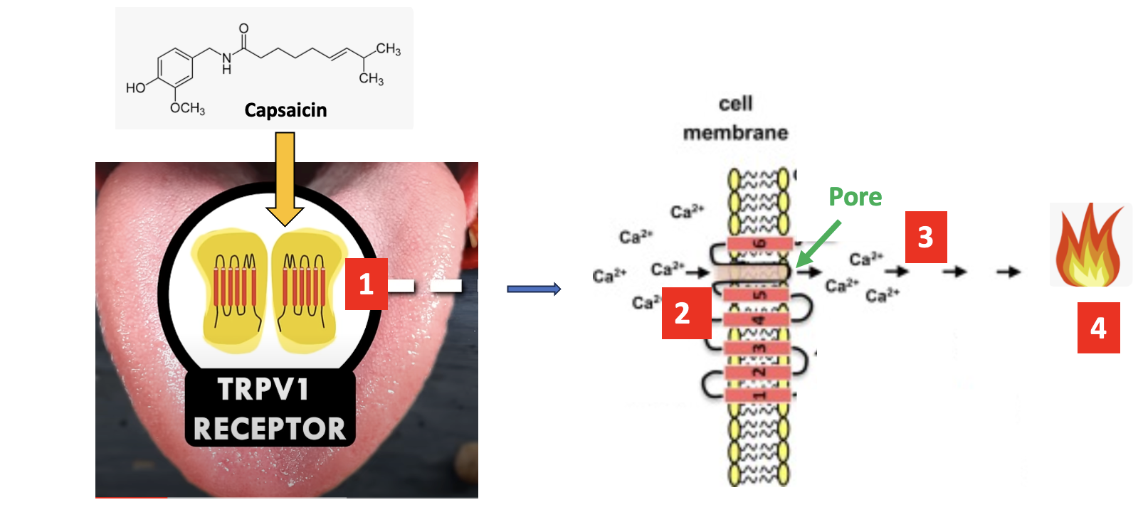 Figure 1. A simplified diagram of the effect of capsaicin. [1] Capsaicin binds to TRPV1 on the tongue. [2] This causes the opening of a pore (green arrow) in the cell membrane allowing calcium ions to flow into neurons [3]. The calcium ion signal, after several intermediate steps, is interpreted by the brain as heat/pain [4]. Credits: YouTube, Journal of Biochemical Pharmacology