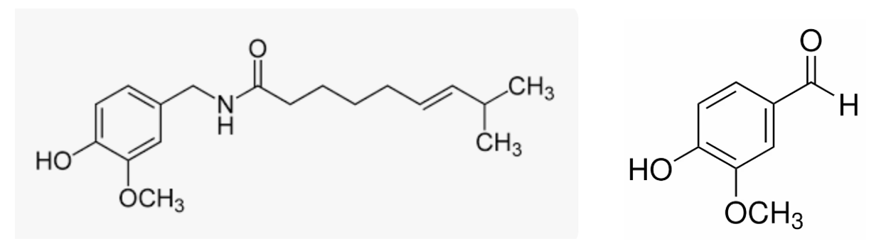 1. If "vanilloid" sounds like it has something to do with vanilla, it does. Note the similarity between the chemical structures of capsaicin (left) and vanillin (right) -- the chemical that gives vanilla its flavor.