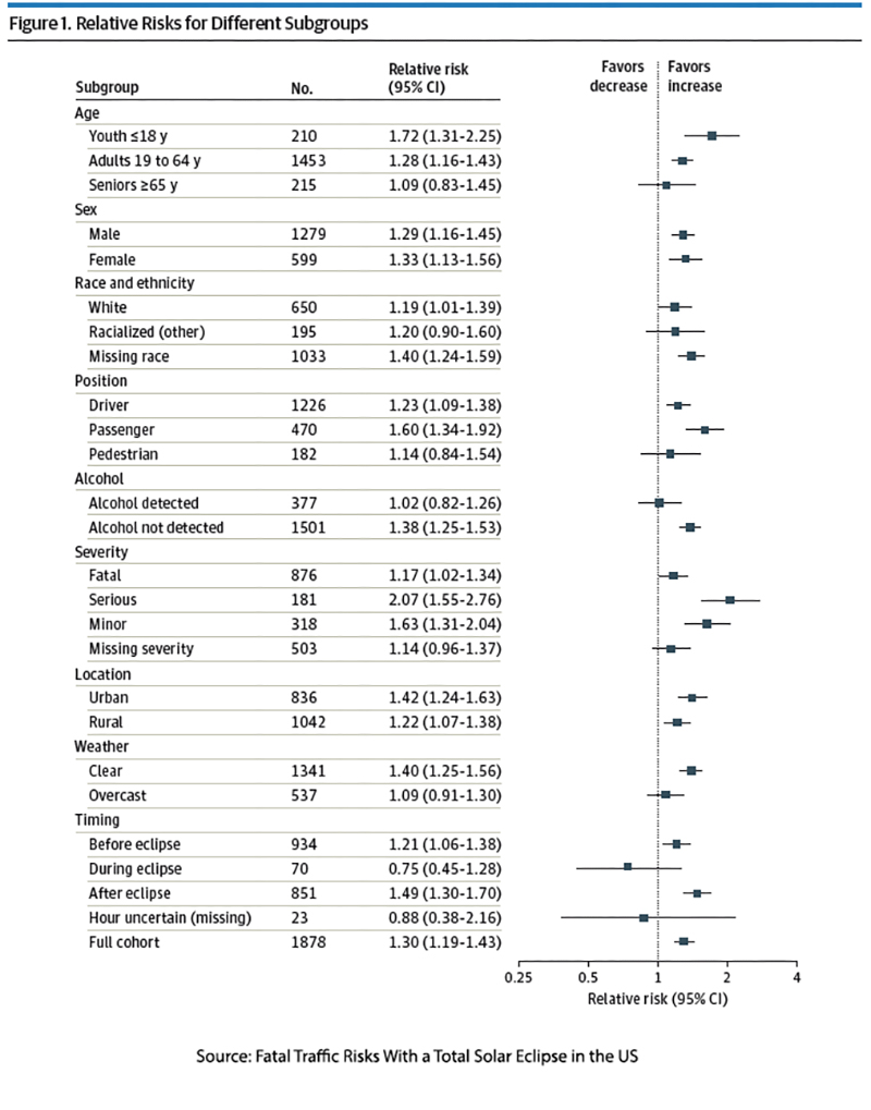 They found that 741 individuals were involved in fatal crashes during that interval. When compared to a comparable “control” interval, the time around the eclipse resulted in a 1.31 relative risk.
