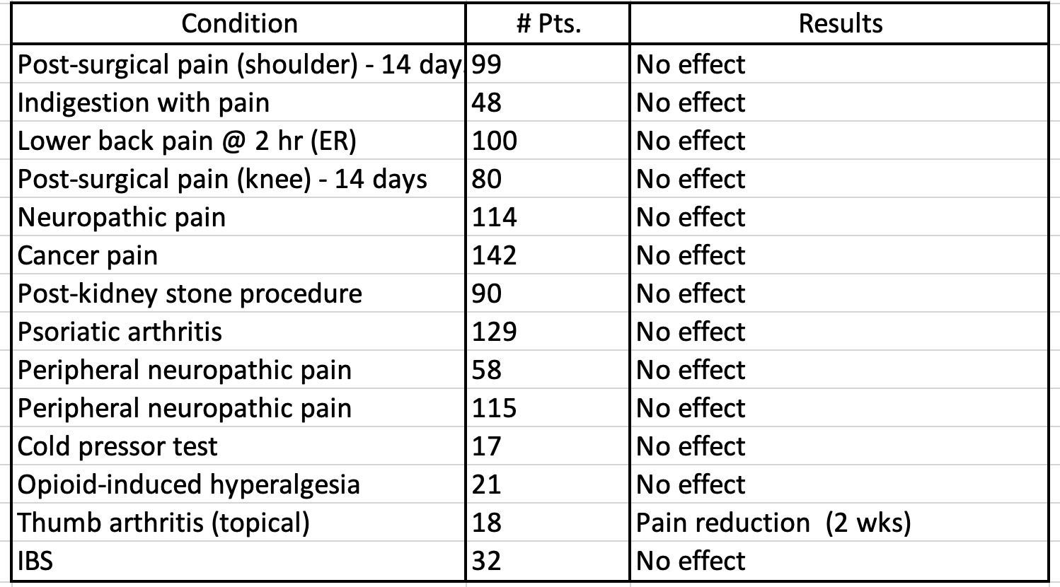 No one should be surprised that CBD didn't make the cut as a pain therapy. The pseudo-drug has been claimed to have utility for nearly every malady suffered by humans and other beasts. In his article, Moore comments on the ubiquity of unsubstantiated claims (1) made about CBD. (There are claims for at least 10 different conditions that can be found on Twitter alone.)