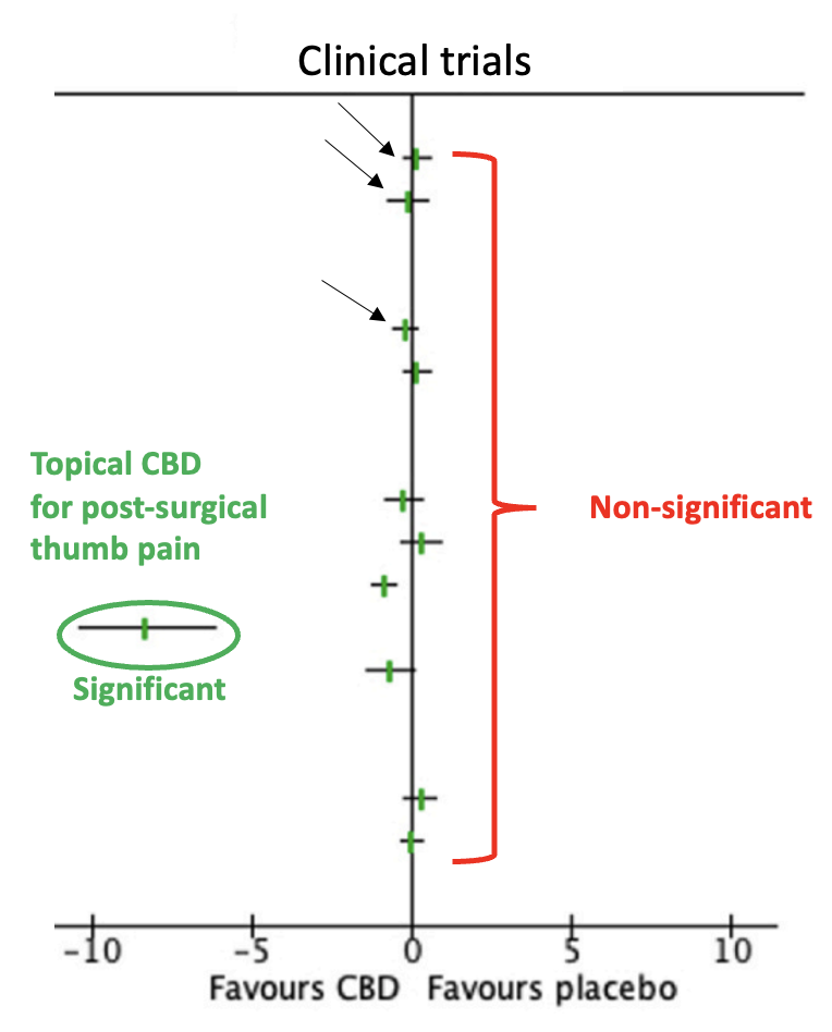 Figure 1. A Forest plot of the 16 trials that met the meta-analysis criteria. The area to the left of the vertical zero line indicates trials where CBD outperformed placebo (one). The area to the right indicates trials where placebo outperformed CBD (none). When a hatch-mark touches (or crosses) the vertical zero line, the results are not significant. Only one (green oval) of 16 trials – topical CBD oil for arthritic thumb pain – showed a significant advantage of CBD over placebo, but it should be noted that this trial had only 18 participants.