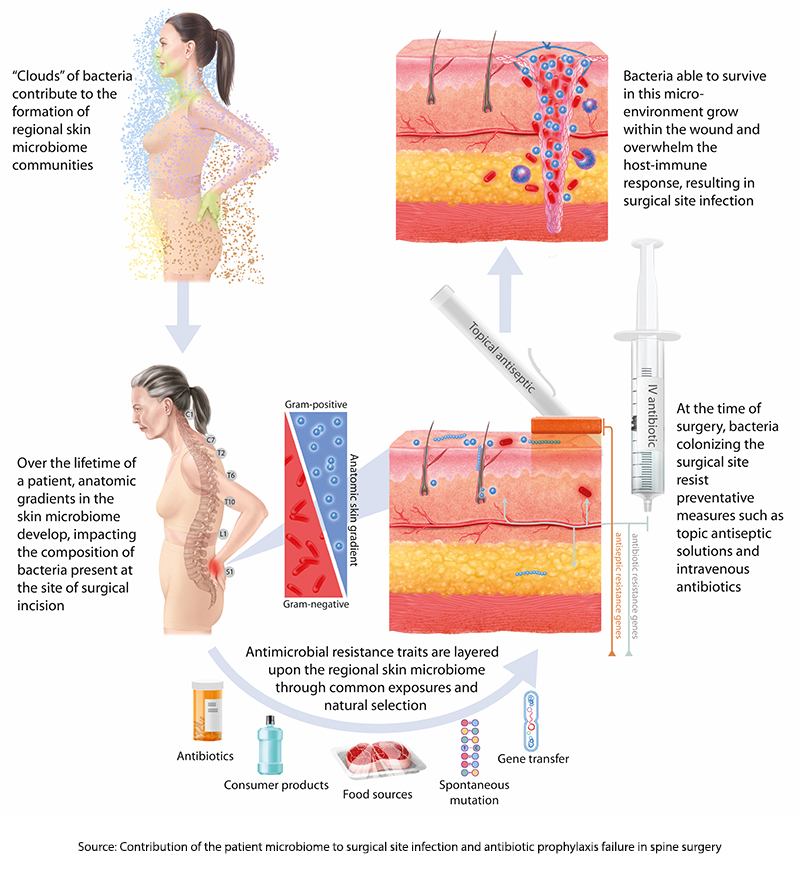 59% of the pathogens that caused SSIs were resistant to the antibiotics given at the time of surgery, indicating that bacteria with antibiotic-resistance genes were already circulating on the skin before the first cut. Genomic sequencing of “relevant genes” responsible for antimicrobial resistance found that these signatures could be identified pre-operatively 94% of the time from the preoperative samples of the patient’s microbiome. Finally, looking at a more extensive set of SSIs associated with these spinal procedures, there was no evidence that “exogenous strains,” those present in the environment, were responsible for any of the infections.