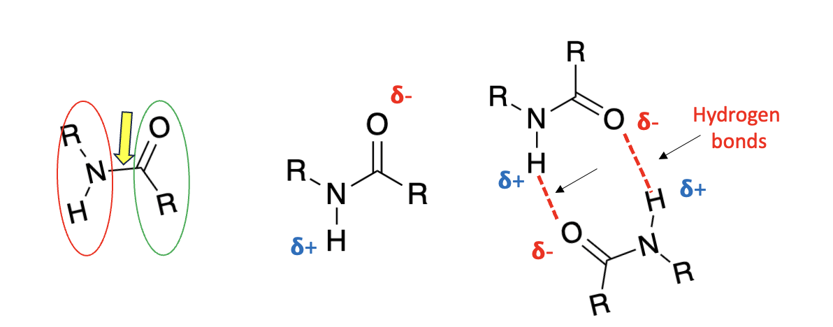 (Left) An amide is the product of an amine (red oval) reacting with a carboxylic acid (green oval). The amide covalent bond (yellow arrow) is quite strong. (Center) The same molecule is drawn to depict an imbalance of charge. Because of the difference in electronegativity between nitrogen and hydrogen, the hydrogen atom has a partial positive charge (delta-plus). Likewise, because of the difference in electronegativity between the oxygen and carbon atoms, oxygen has a partial negative charge (delta-minus). Unsurprisingly, there is an attraction between the two. (Right) Two identical amide molecules are shown interacting via two hydrogen bonds. R stands for any alkyl group.