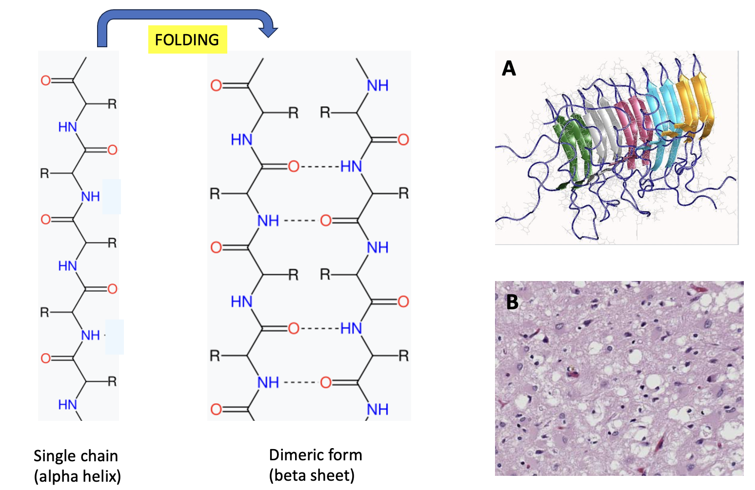 (Left) A segment of a single protein chain in the alpha-helix of normal PrPc. When the protein misfolds two formerly single strands of the proteins are folded together, "stuck" to each other because of internal hydrogen bonding. This results in the formation of four beta-sheets, which change the shape and function of the protein. In particular, the beta-sheets, once formed, result in a cascade where the misfolded proteins form a polymeric clump, which is toxic to brain cells. (Right) (A) An example of five proteins (in this case amyloid) clumped together. Credit: Wikipedia (B) Human brain tissue with Creutzfeldt-Jakob disease has a sponge-like appearance. Credit: Teresa Hammett, Centers for Disease Control and Prevention.