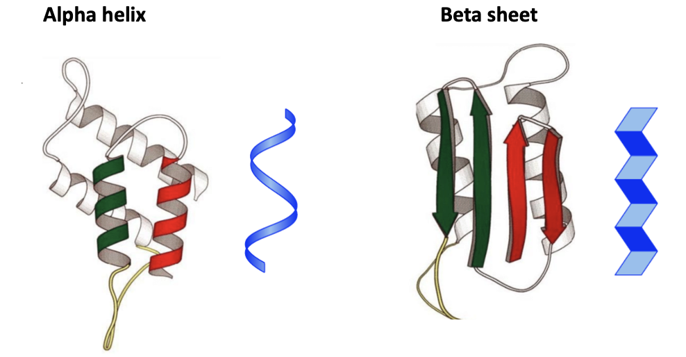 Normal prion proteins exist in an alpha helix (left). The helices are composed of single chains of amino acids – a common 3D structure for proteins, But when PrPc rearranges, the protein takes a different form. The red and green arrows represent four beta-sheets, another common motif in proteins. But this is where the problems arise with prions. In a beta-sheet two single chains are "stuck" together by hydrogen bonding, which is shown on the molecular level below. The blue figures are representations of the shape of both the normal and pathogenic proteins.