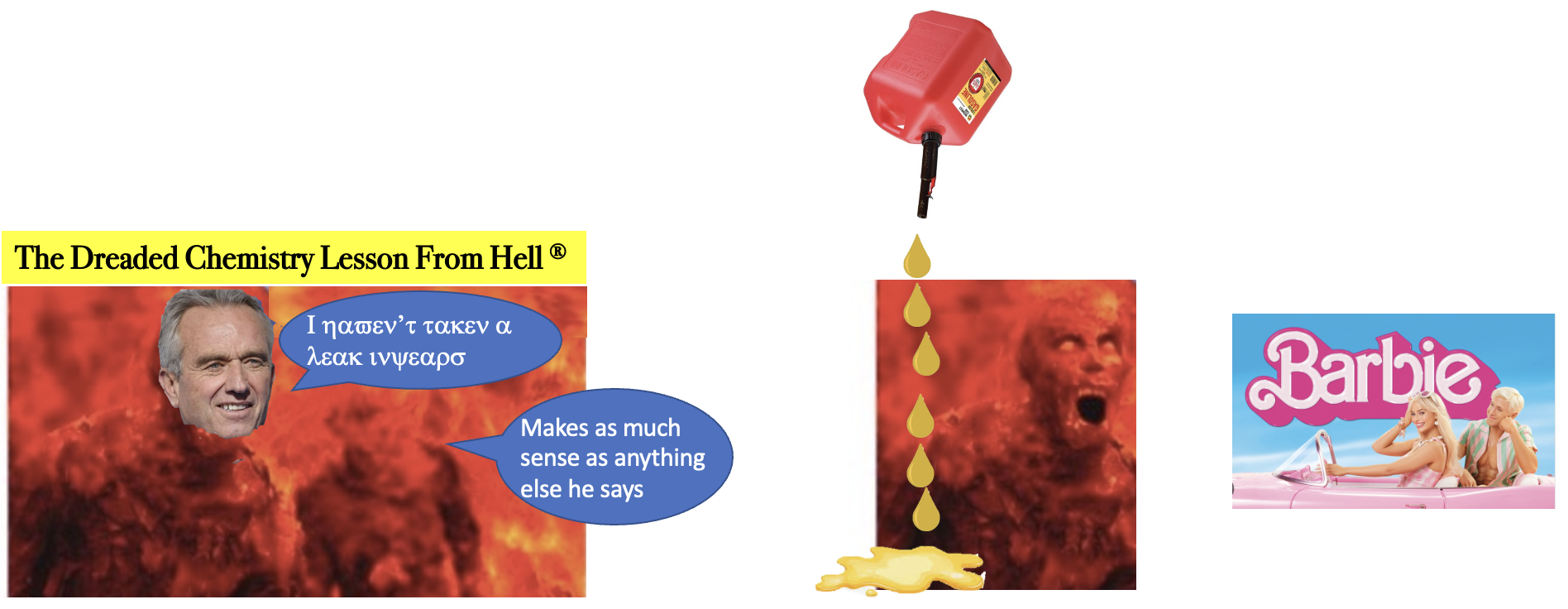 (Left) Steve, our normal co-host of the DCLFR®, left hell for something worse. Hell HR required him to view the entire Barbie Movie, a deeper stage of hell, for purposes of career development. But we are honored to have guest host RFK Jr., step in with some words of wisdom – except for the wisdom part. His co-host Irving (right) appears to be hopelessly confused. Just like Kennedy himself. (Right) Steve appears to be less than enamored with the Barbie Movie, to the point where he attempts self-immolation just to escape. This is generally an ineffective strategy for those who already dwell in hell.