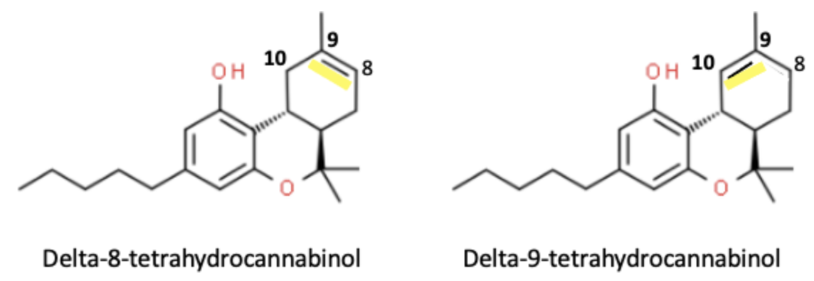 The two THC isomers (Figure 1) differ only by the position of the double bond (yellow). Any medicinal chemist will tell you that the two will have similar properties. Note that the nomenclature of the molecule is responsible for the nicknames Delta-8 and -9. The figure on the left has a double bond between carbon atoms 8 and 9. In chemical nomenclature, the lower number is used, hence, Delta-8. The same holds for Delta-9 (right).