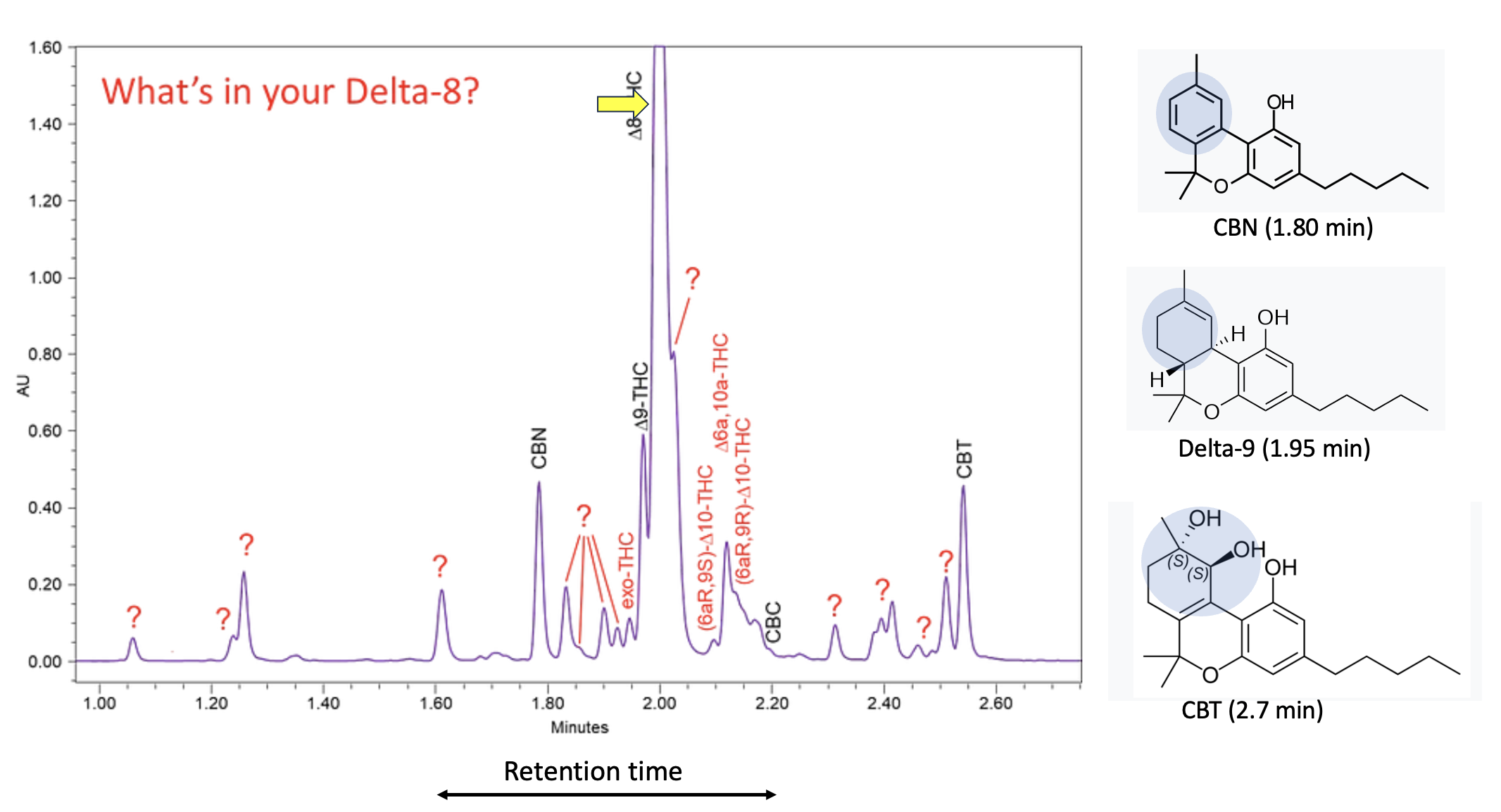 Here's where the synthesis comes in. The quality of Delta-8 depends very much upon what reaction was chosen to convert CBD to delta-8 and the skill of the "chemist" performing the reaction. The "standard" method involves heating the #### out of CBD with a strong acid. If there's a better set of conditions to ensure a messy reaction it's not obvious. The mess is obvious. Figure 2 shows a sample of delta-8 that contains an Avagadro's Number of impurities. This should not be surprising to any organic chemist, given the chemical structures of CBD and THCs. and the harsh conditions employed. The number of impurities (Figure 2) reflects the difficulty in this synthesis.