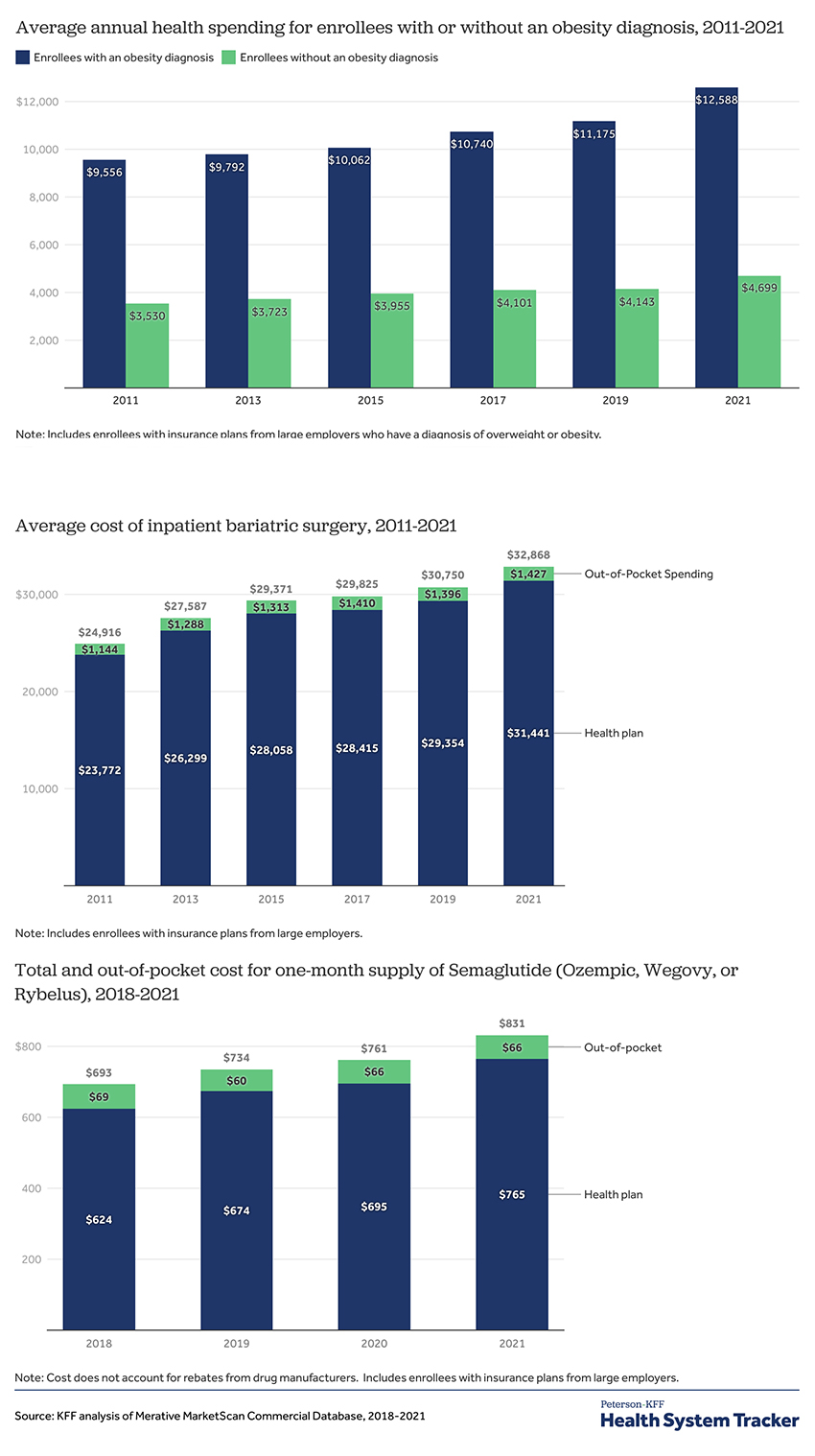 - The spending on individuals with obesity is roughly 2.5 fold greater than those individuals that are not obese – both have increased by essentially the same percentage, 33%.