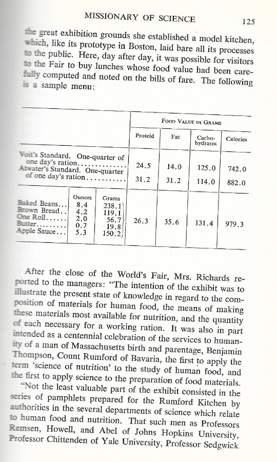 “The Life of Ellen H. Richards,” Caroline L Hunt, American Home Economics Association, 1958, Page 125, Table on Food Value in Grams.
