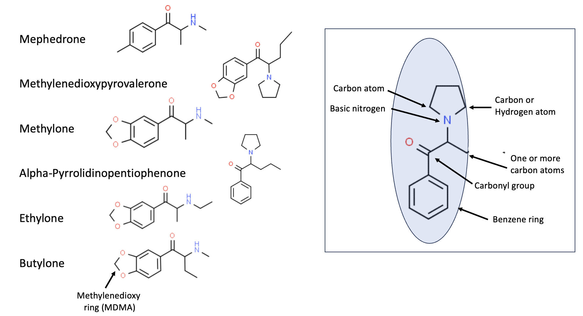 Figure 1. (Left) Six members of the cathinone series, powerful stimulants that can cause hallucinations, delusions, and erratic behavior. And presumably, face chewing. (Right) The pharmacophore (2) of the cathinones, shown in the blue oval, is quite specific. All six drugs contain a benzene ring connected by a carbonyl group (ketone) to a carbon attached to a basic nitrogen bound to at least one carbon atom. It would be trivial to design and synthesize dozens of novel analogs.