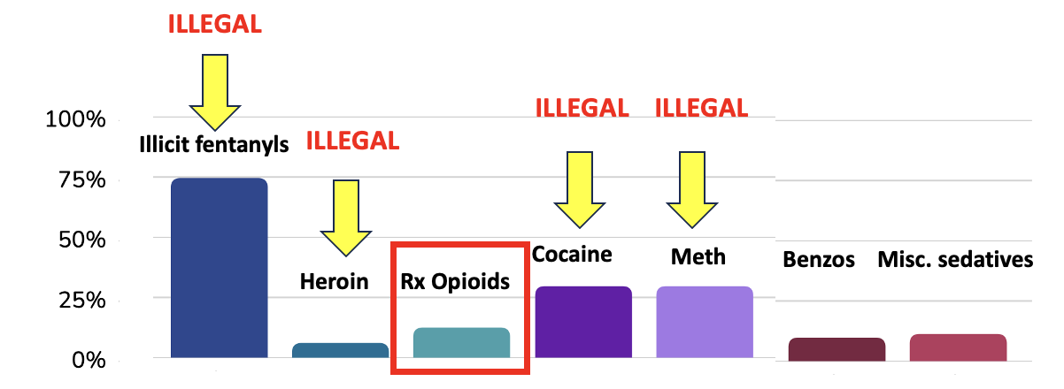 Figure 2. Percentages of overdose deaths involving select drugs and drug classes in 2022, Overall (30 jurisdictions). Note that (by far) drug overdose deaths are a result of illegal, not prescription drugs. Preliminary data for 2023 tells the same story. Modified from: SUDORS Dashboard.
