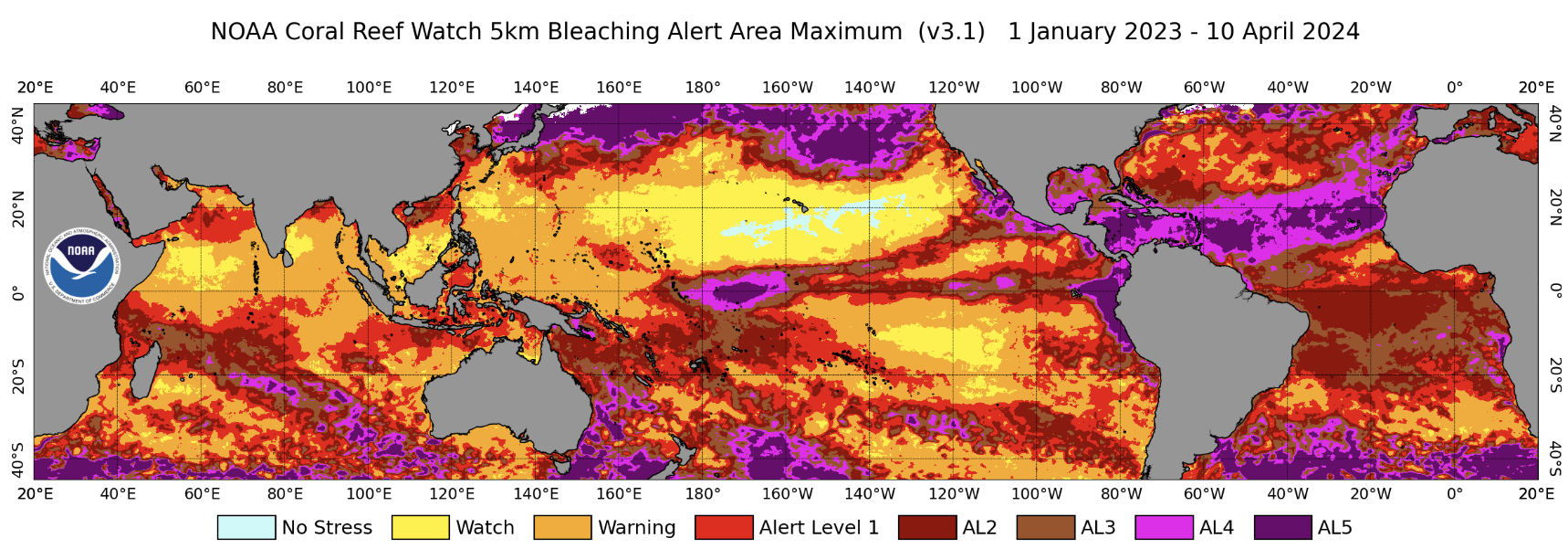 Coral Bleaching Alert Area Maximum map from NOAA's Coral Reef Watch's global satellite, between January 1, 2023, to April 10, 2024. The darker the color, the worse the bleaching. Shown are Australia, South America, and the waters adjacent to both. Not good.