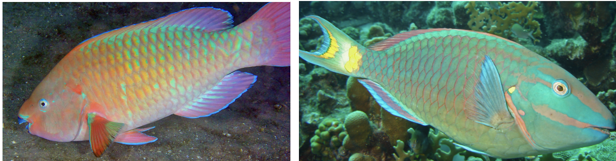 Two of ~100 known species of parrotfish. (Left) Rainbow Parrotfish (Flickr). (Right) Stoplight Parrotfish (Wikimedia Commons)