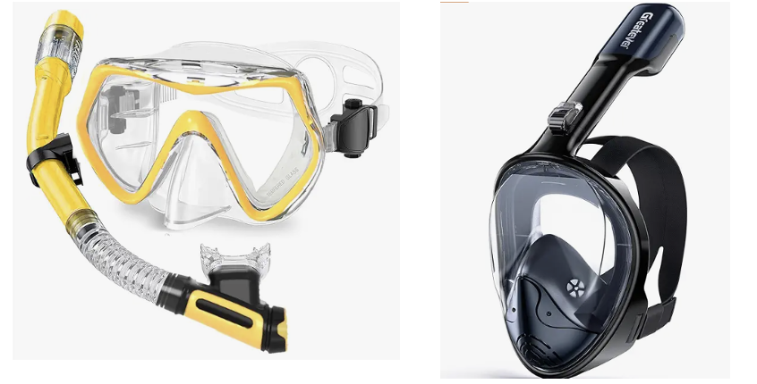 (Left) A traditional two-piece snorkeling set. (Right) A full-face snorkel.