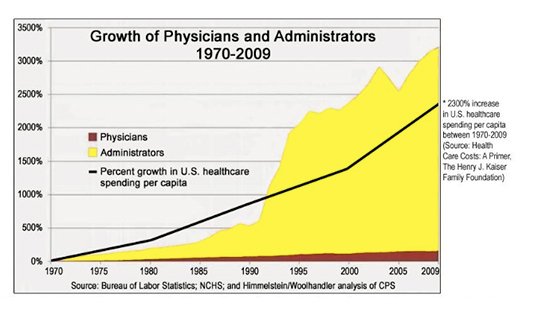 Administrative costs, as compared to labor costs, have risen dramatically. The Commonwealth Fund reports that Canadian hospital and physician administrative costs were 40% less than in the US. Administrative costs are often hidden but are reflected in increased hospital costs, insurance, and physician costs.