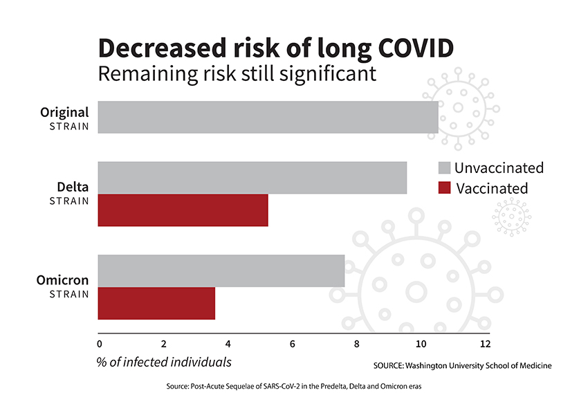 The incidence of PASC was reduced with each successive variant, and the reduction was more pronounced among the vaccinated than the unvaccinated.
