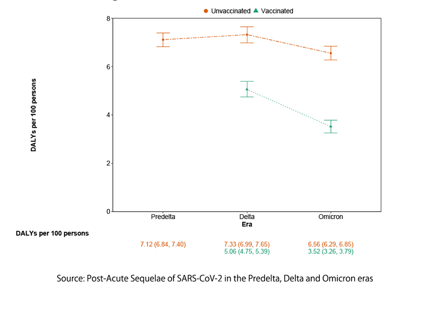 They calculated the degree to which PASC resulted in disability, expressed as disability-adjusted life years (DALY). While there was a slight decline in DALY overall, the vaccinated showed the most protection from lost time.