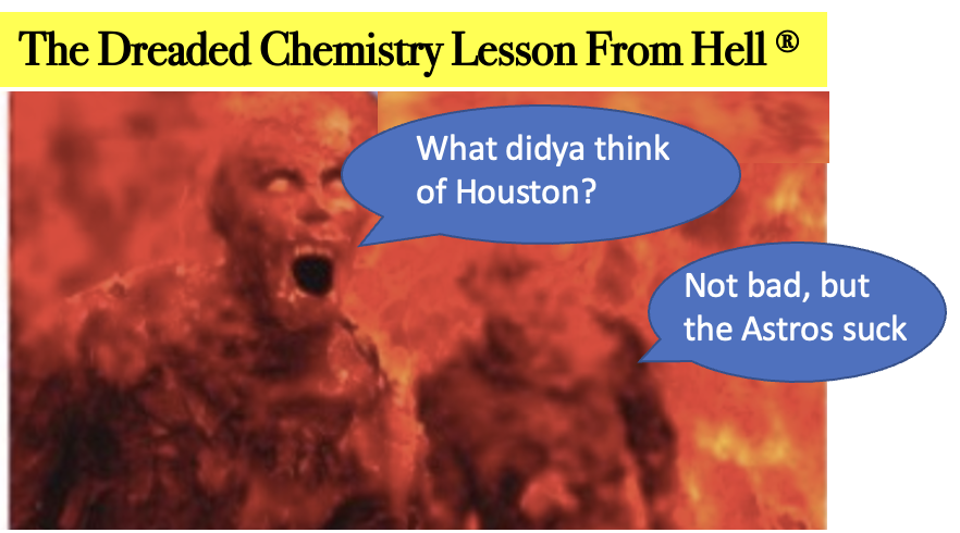To explain this, we need some help from our hell-bound friends Steve and Irving, your loyal but always cantankerous hosts of The Dreaded Chemistry Lesson From HellTM. They were on vacation in powerless, 100o Houston but left because it was too chilly. Let's welcome them back!