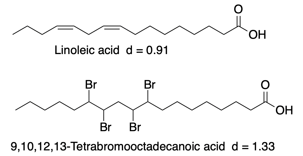 Linoleic acid, like citrus oils, is lighter than water, with a density of 0.92 g/mL. However, bromine and organobromine derivatives are usually quite dense. The following examples provide evidence of this: