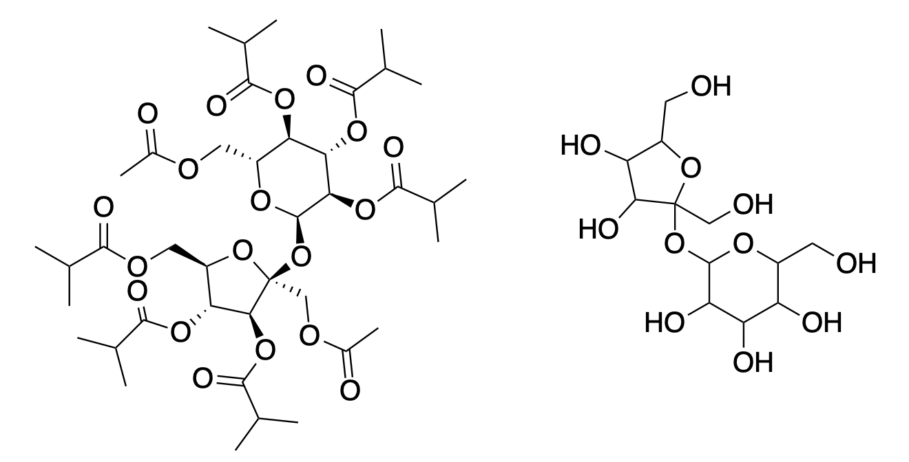 (Left) Sucrose acetate hexaisobutyrate, that pinwheel-looking nightmare, is actually not as crazy as it seems. It is merely sucrose (right), with all of the hydroxyl groups converted to isobutyric esters.