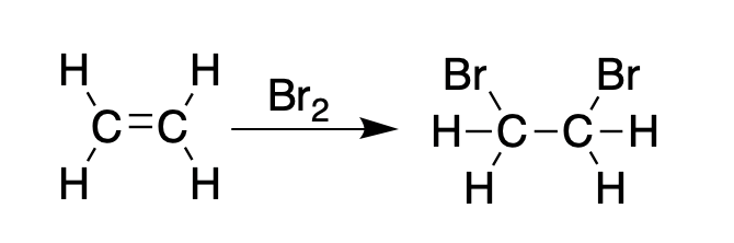 Ethylene reacts with bromine to form 1,2-dibromoethane.