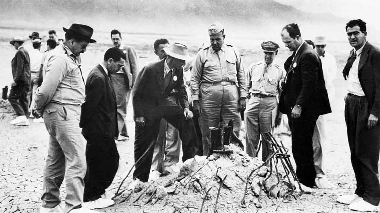 J. Robert Oppenheimer (white hat), Maj. Gen. Leslie Groves (to Oppenheimer's left), and other Manhattan Project staff, at Trinity site ground zero after the test of the plutonium bomb, "Gadget." The man on the far right staring at the camera is Dr. Victor Weisskopf, who, two decades later, would try to teach the author physics at M.I.T. Source: U.S. Army Signal Corp