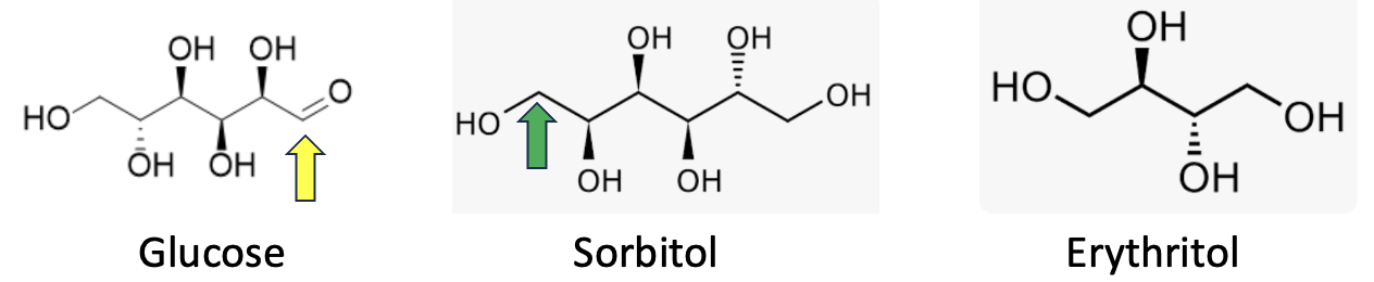 Figure 2. Note that in sugar alcohols the aldehyde group (yellow arrow) has been reduced (two hydrogen atoms added) to form an alcohol group (green arrow), which is why this class of compounds is also referred to as reduced sugars. In organic chemistry, reduction means the addition of hydrogen. Sorbitol has two more hydrogen atoms than glucose.