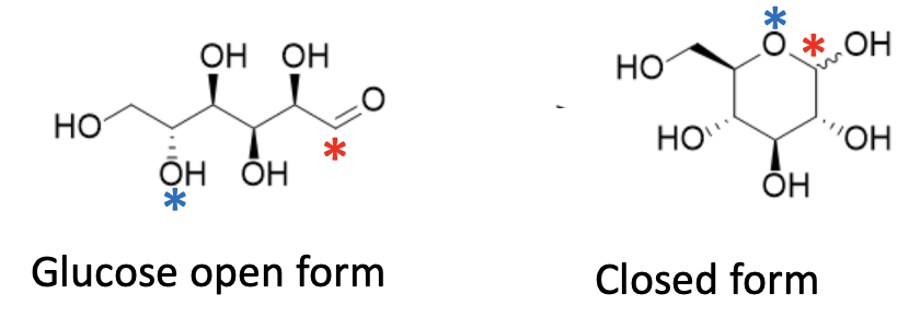 Figure 1. Glucose interconverts at lightning speed. The open form contains an aldehyde (left, red asterisk) and an alcohol group (left, blue asterisk), which react reversibly with each other, while the closed form has neither. The asterisks in the closed form correspond to the same atoms in the open form.