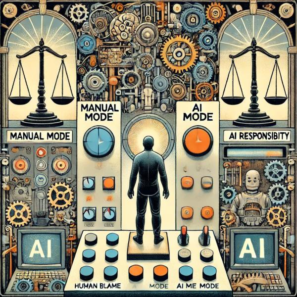“Taken together, the evidence … suggest[s] that people blame humans more for AI mistakes when the AI system had a manual mode. The results further suggest that a manual mode reduces how much people blame the manufacturer and the AI itself for mistakes.”