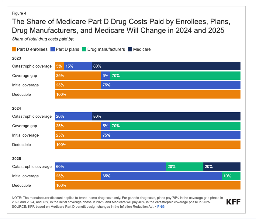 Thanks to the DRA, beneficiaries have a $2,000 cap placed on out-of-pocket spending and an end to catastrophic phase co-payments. [2] There are also reductions in the share paid by Medicare, with those costs being transferred to Part D plans or manufacturers. This graphic by the Kaiser Family Foundation captures the changes.