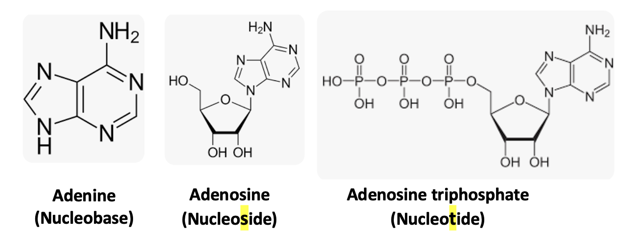 Figure 1. Madness. Adenine (left) is a nucleobase, one of the four found in DNA. Once deoxyribose (a sugar) is attached to adenine it becomes adenosine (center), a nucleoside. The addition of a triphosphate group gives the "famous" molecule (right) adenosine triphosphate (ATP), which is a nucleotide. Is it any wonder why most people hate organic chemistry?