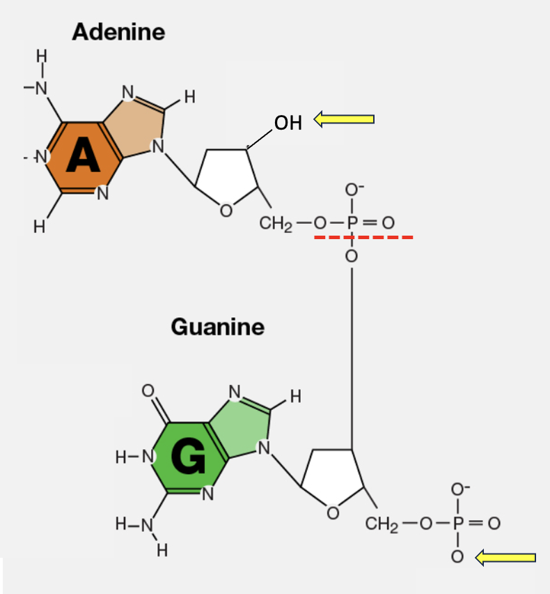 - The yellow arrows indicate the reaction sites where the next nucleotide will be added.