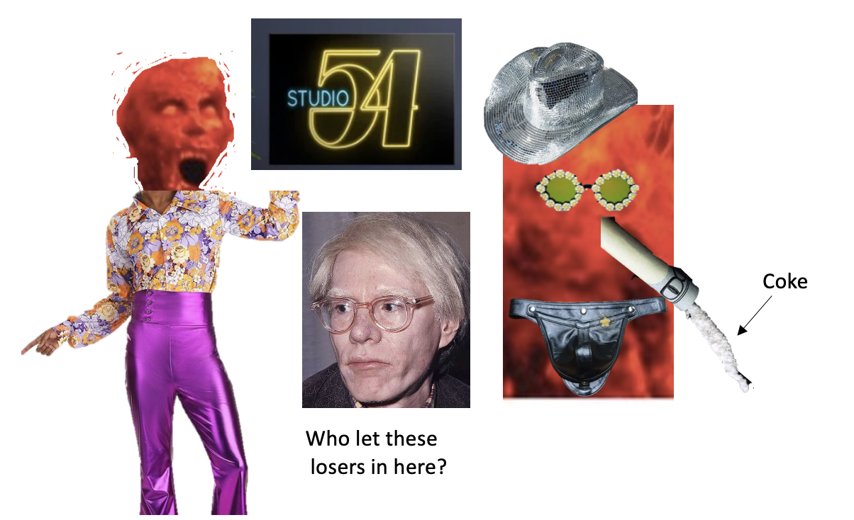 Steve and Irving, both hypocrites, have short memories. Despite their puritanical remarks, they have a sordid past, as is revealed in this 1978 photo from the Studio 54 scene. Steve tries (and fails) to attract easy women with his John Travolta hip thrust. Irving, on the other hand, likes leather and toot. Andy bemoans the waning of clientele quality. Images: Attribution-NonCommercial-ShareAlike 2.0 Generic, Stockbridge, Flickr