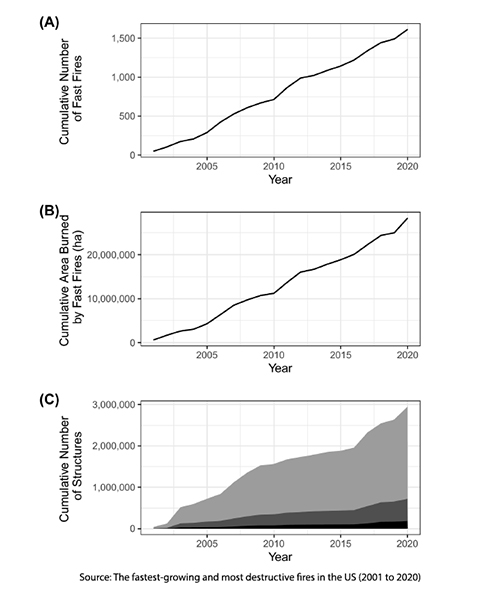- Between 2001 and 2020, fast fires impacted 58 of the 85 level III ecoregions (regions identified by similar climate, geology, vegetation, wildlife, and soil types), threatening over 1.7 million structures and causing $18.9 billion in suppression costs, along with 337 fatalities (66% of total) and 5623 injuries (43% of total).