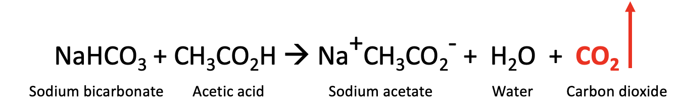 Baking soda reacts immediately with vinegar to form sodium acetate, water, and carbon dioxide. The red arrow indicates that a gas is formed.