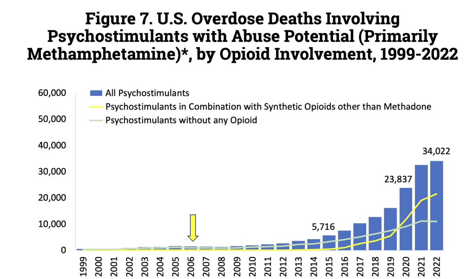 In 2006, when CMEA was passed, the number of fatal overdoses from methamphetamine was low, well under 2,000. This number ballooned to 34,000 by 2022 (not shown; that number rose to 36,000 in 2023). Graph: National Institute on Drug Abuse